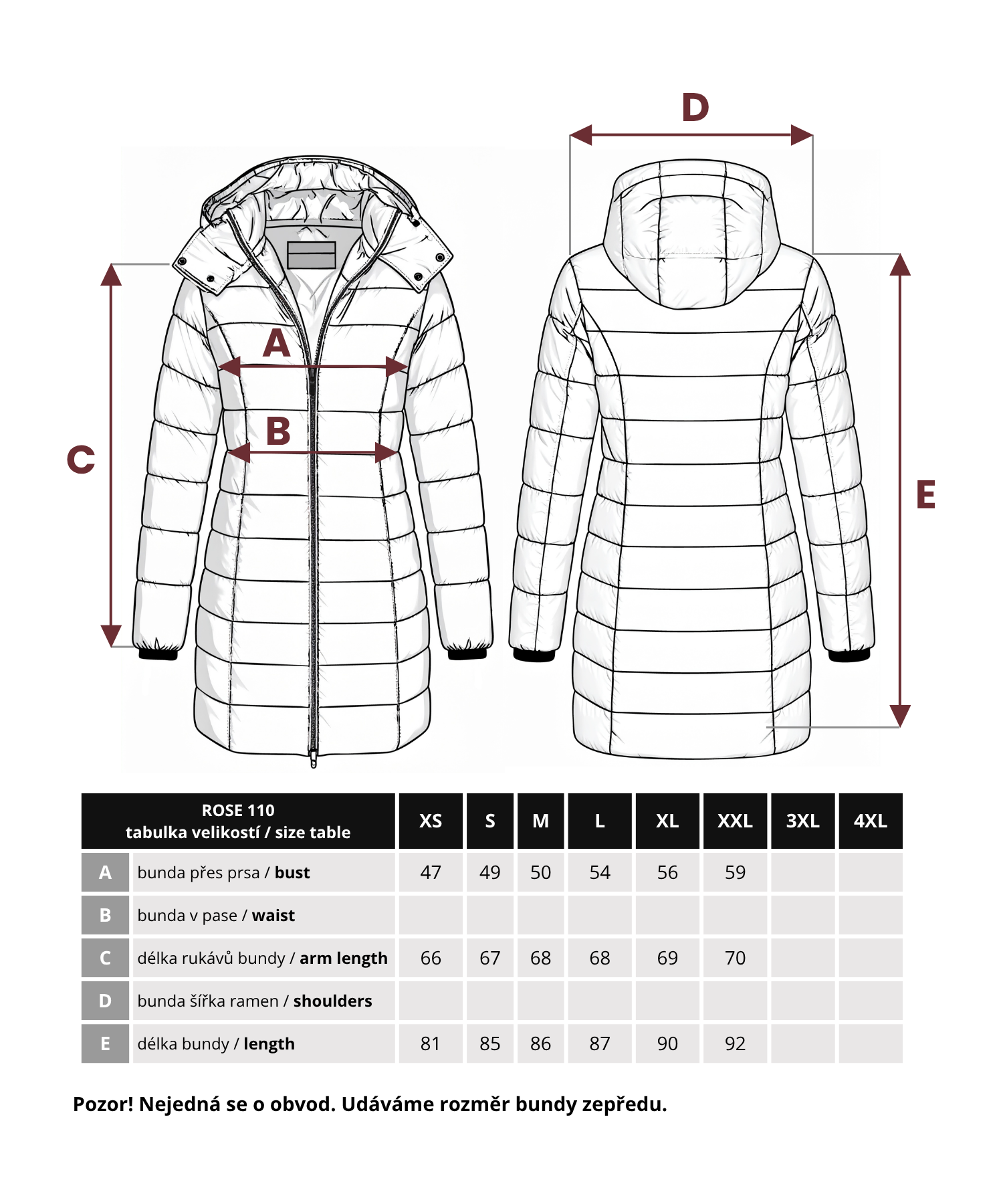 - Přeměřte si doma bundu, která Vám sedí. Dejte si ji na zem - změřte zepředu rozměr přes prsa, rozměr v pase a další rozměry a porovnejte s tabulkou. Obvod je přibližně 2x tolik, co se uvádí v tabulce. Rozměry odpovídají klasickým evropským velikostem. Výrobcem zboží je německá firma.