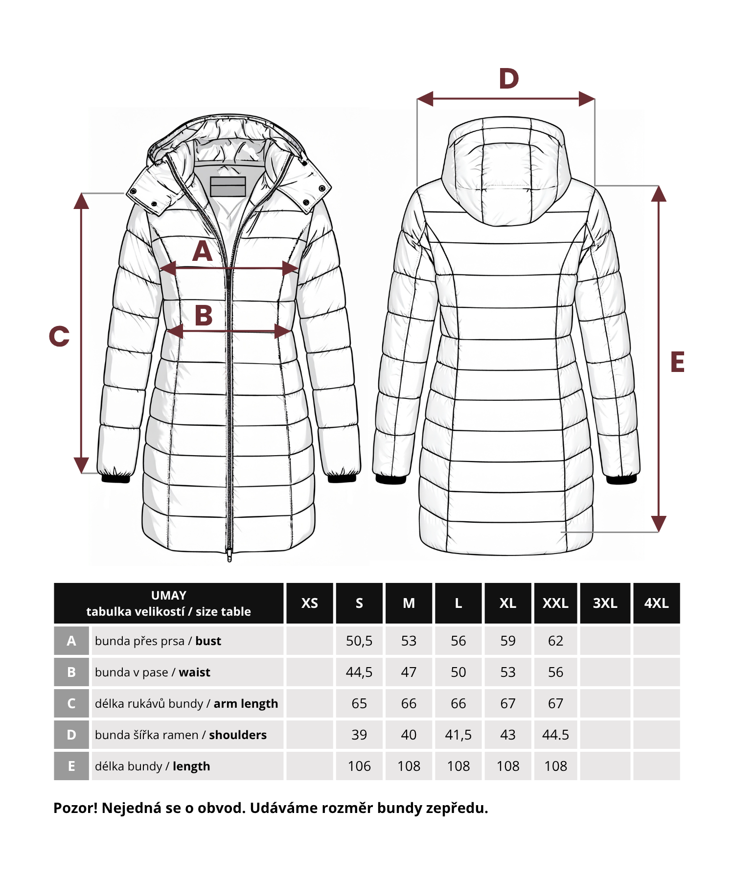 Přeměřte si doma bundu, která Vám sedí. Dejte si ji na zem - změřte zepředu rozměr přes prsa, rozměr v pase a další rozměry a porovnejte s touto tabulkou. Obvod je přibližně 2x tolik, co se uvádí v tabulce. Rozměry odpovídají klasickým evropským velikostem.