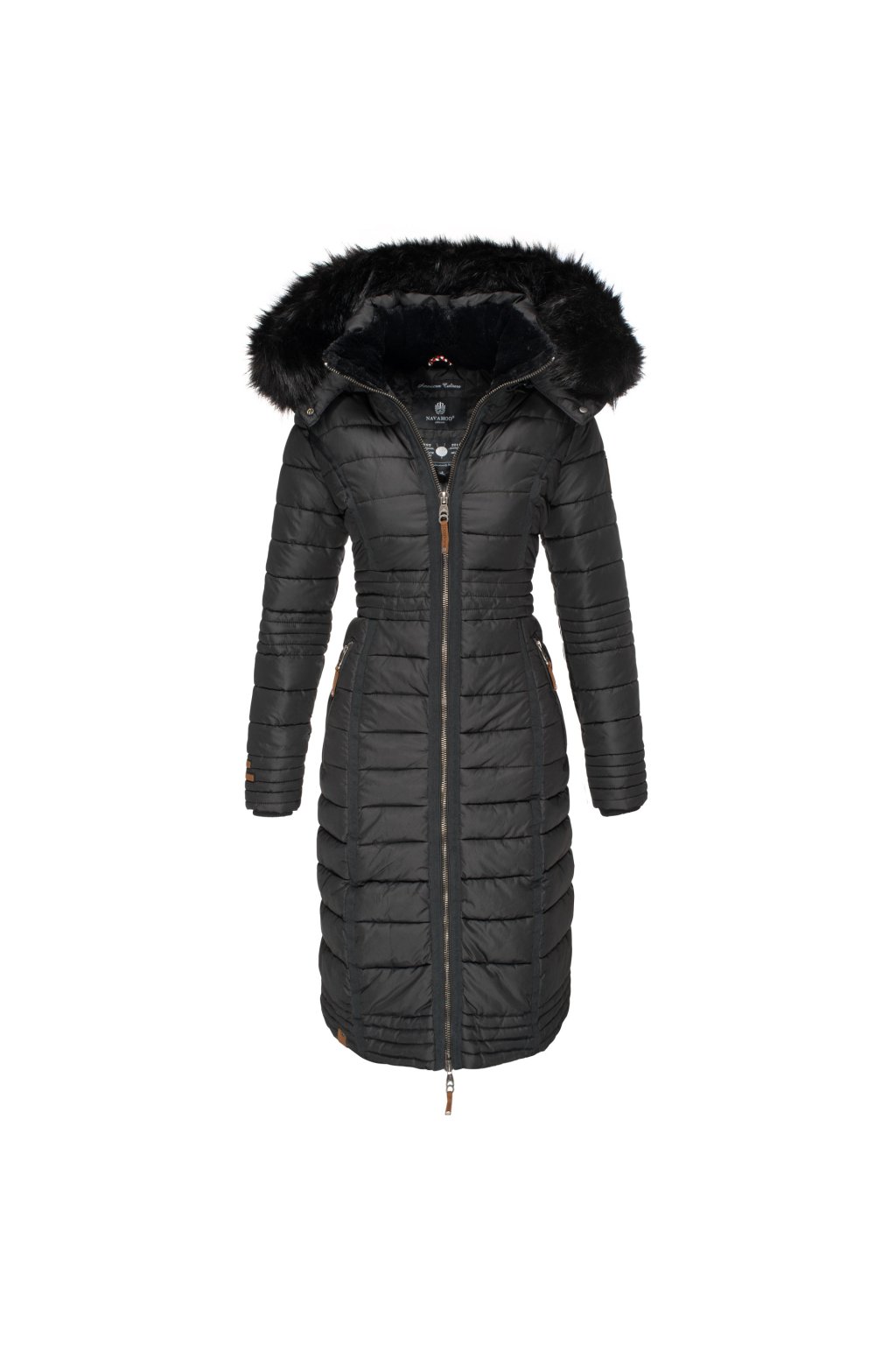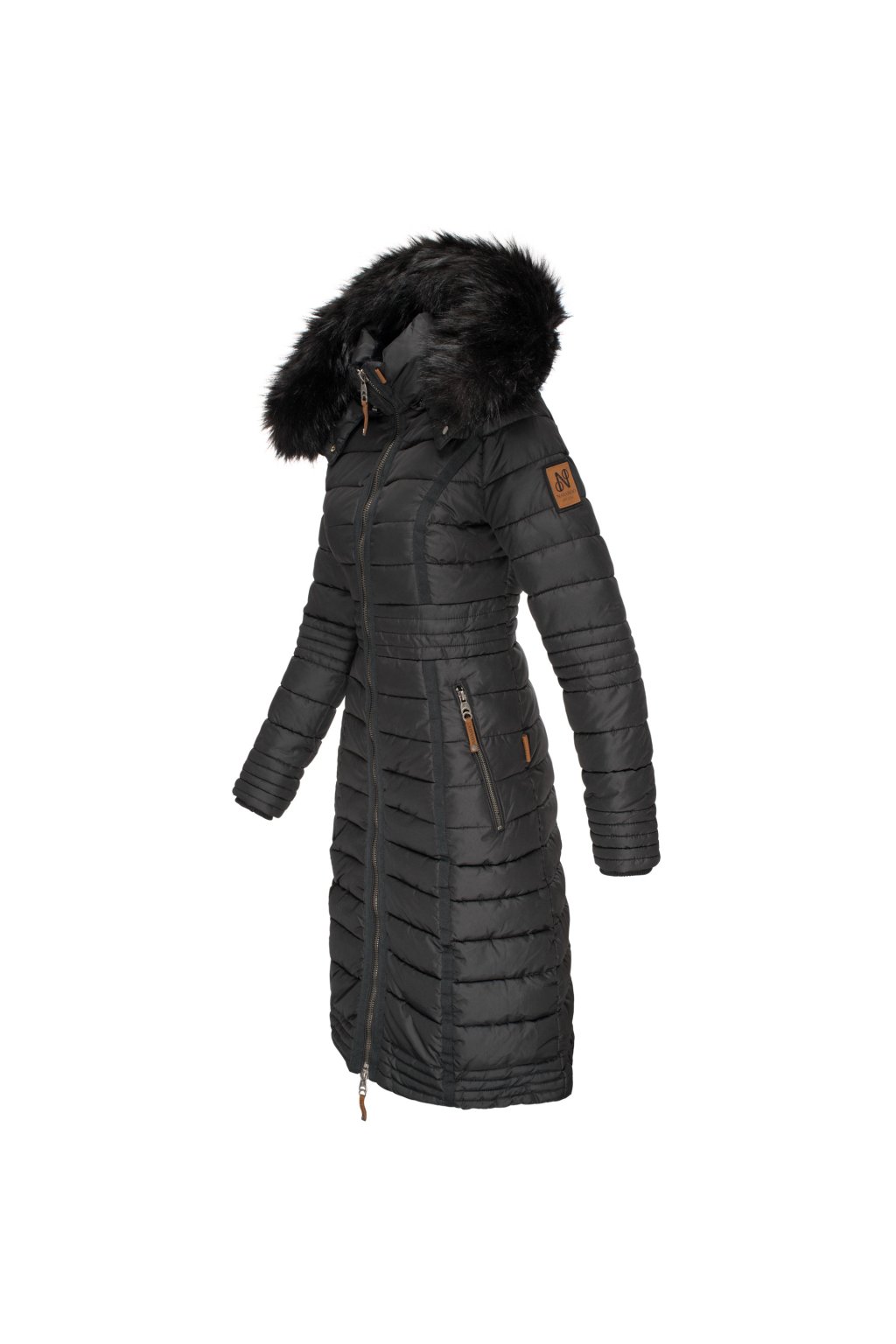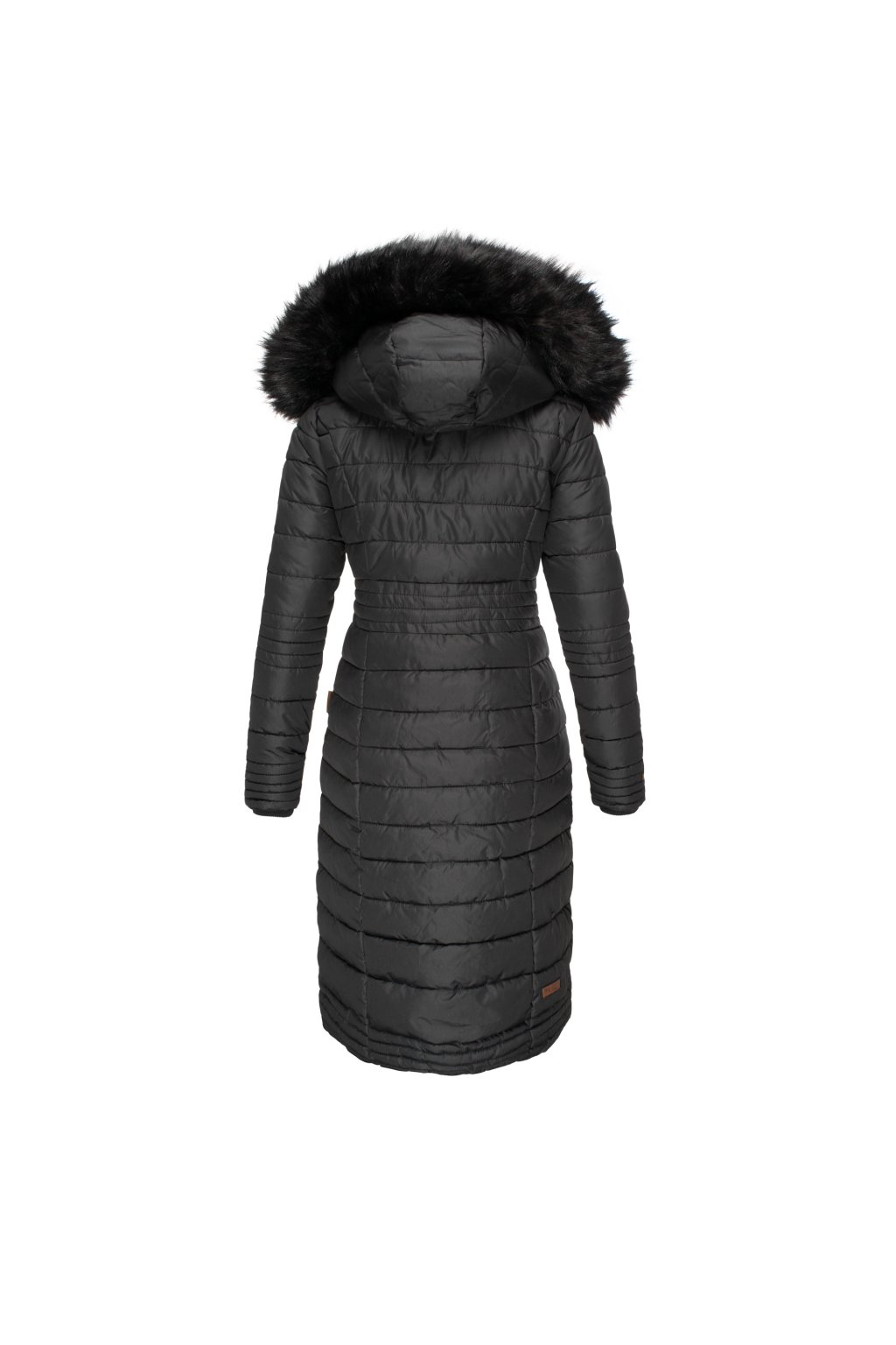 - Stylový dámský dlouhý kabát s módním prošíváním a velkou umělou kožešinou v kontrastní barvě na kapuci