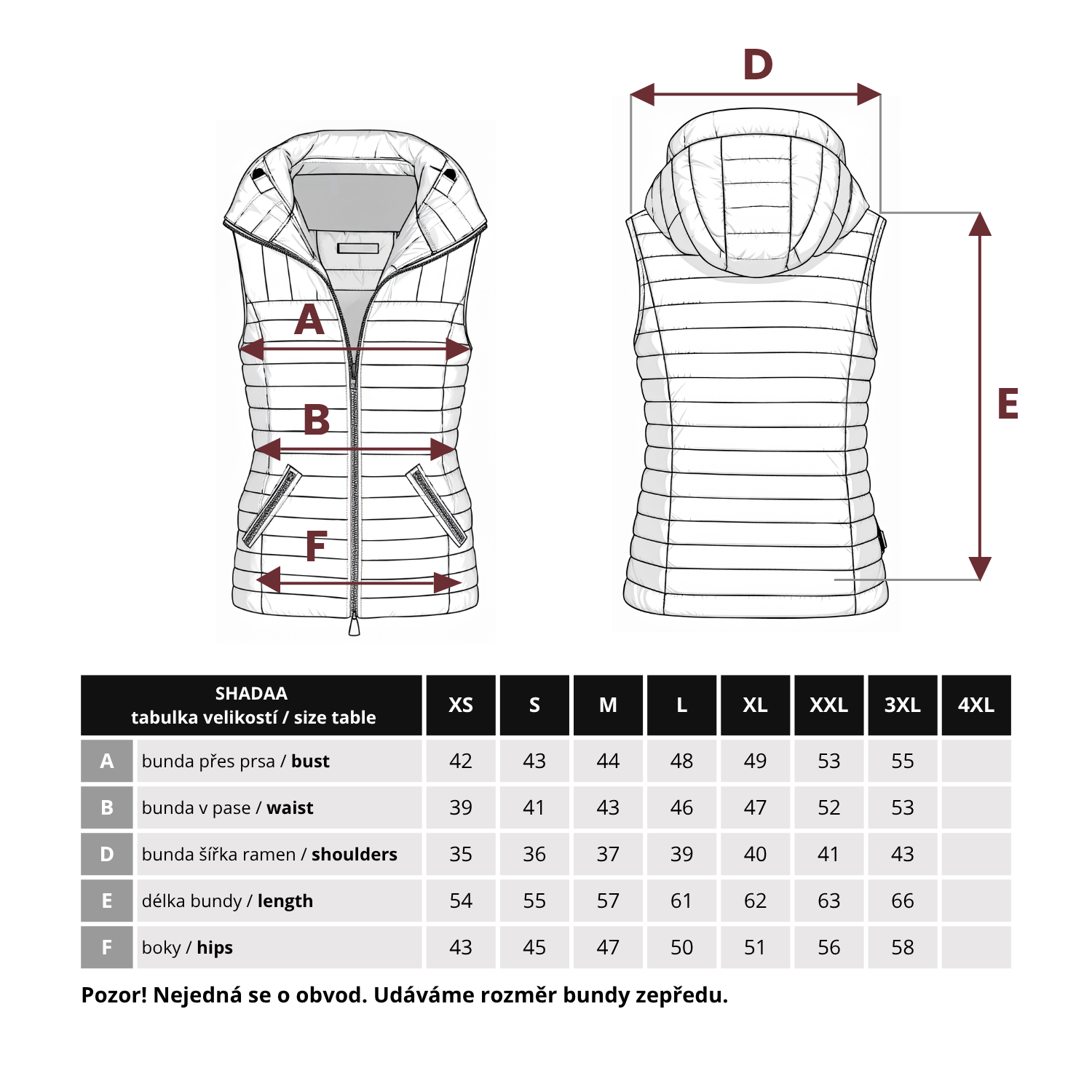 Přeměřte si doma bundu, která Vám sedí. Dejte si ji na zem - změřte zepředu rozměr přes prsa, rozměr v pase a další rozměry a porovnejte s touto tabulkou. Obvod je přibližně 2x tolik, co se uvádí v tabulce. Rozměry odpovídají klasickým evropským velikostem. Výrobcem zboží je německá firma.