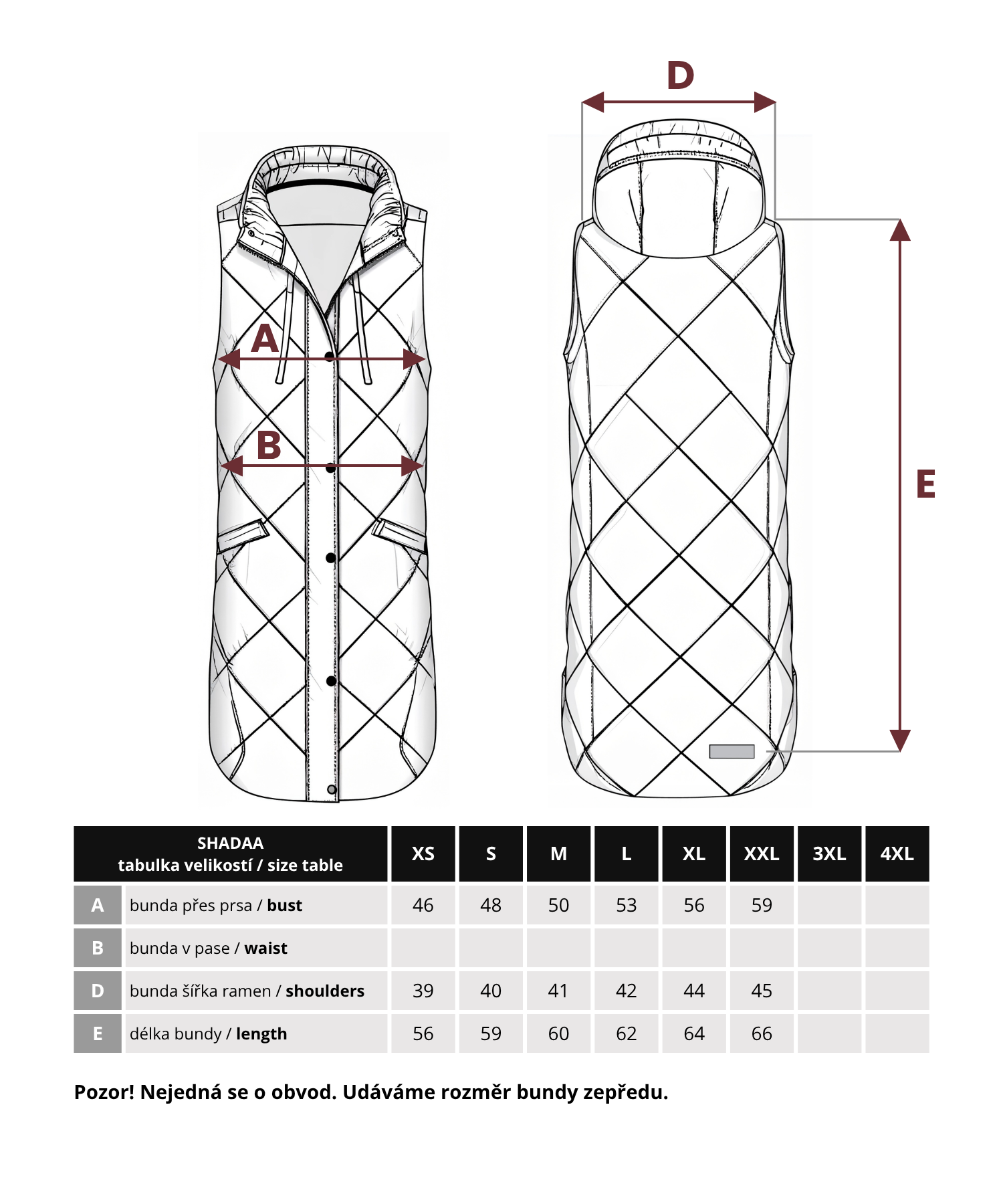 Přeměřte si doma bundu, která Vám sedí. Dejte si ji na zem - změřte zepředu rozměr přes prsa, rozměr v pase a další rozměry a porovnejte s touto tabulkou. Obvod je přibližně 2x tolik, co se uvádí v tabulce. Rozměry odpovídají klasickým evropským velikostem. Výrobcem zboží je německá firma.