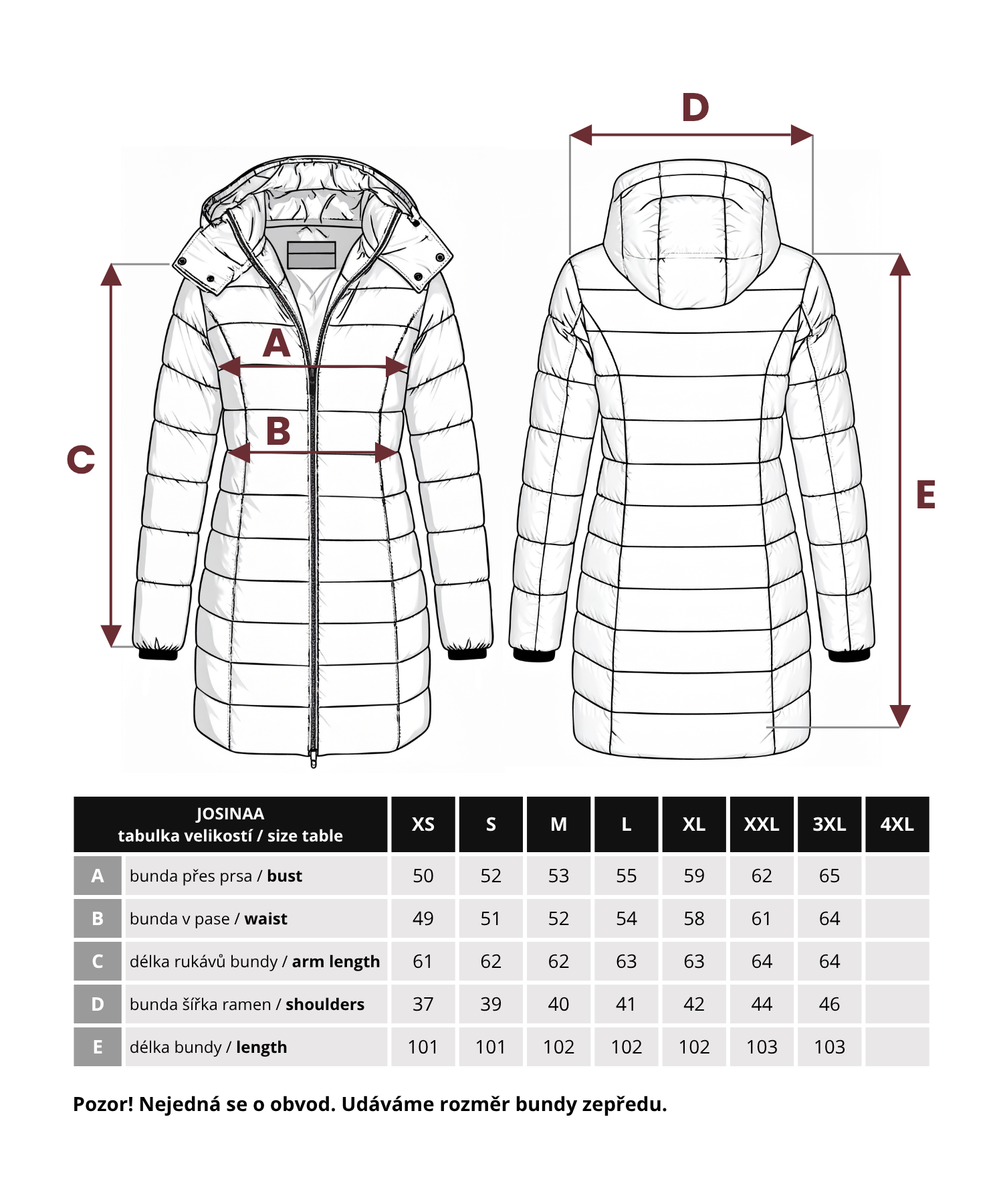 Přeměřte si doma bundu, která Vám sedí. Dejte si ji na zem - změřte zepředu rozměr přes prsa, rozměr v pase a další