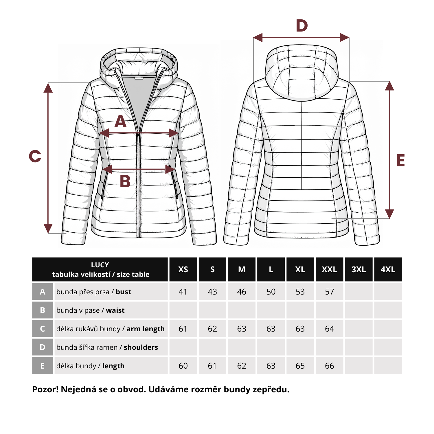 Přeměřte si doma bundu, která Vám sedí. Dejte si ji na zem - změřte zepředu rozměr přes prsa, rozměr v pase a další