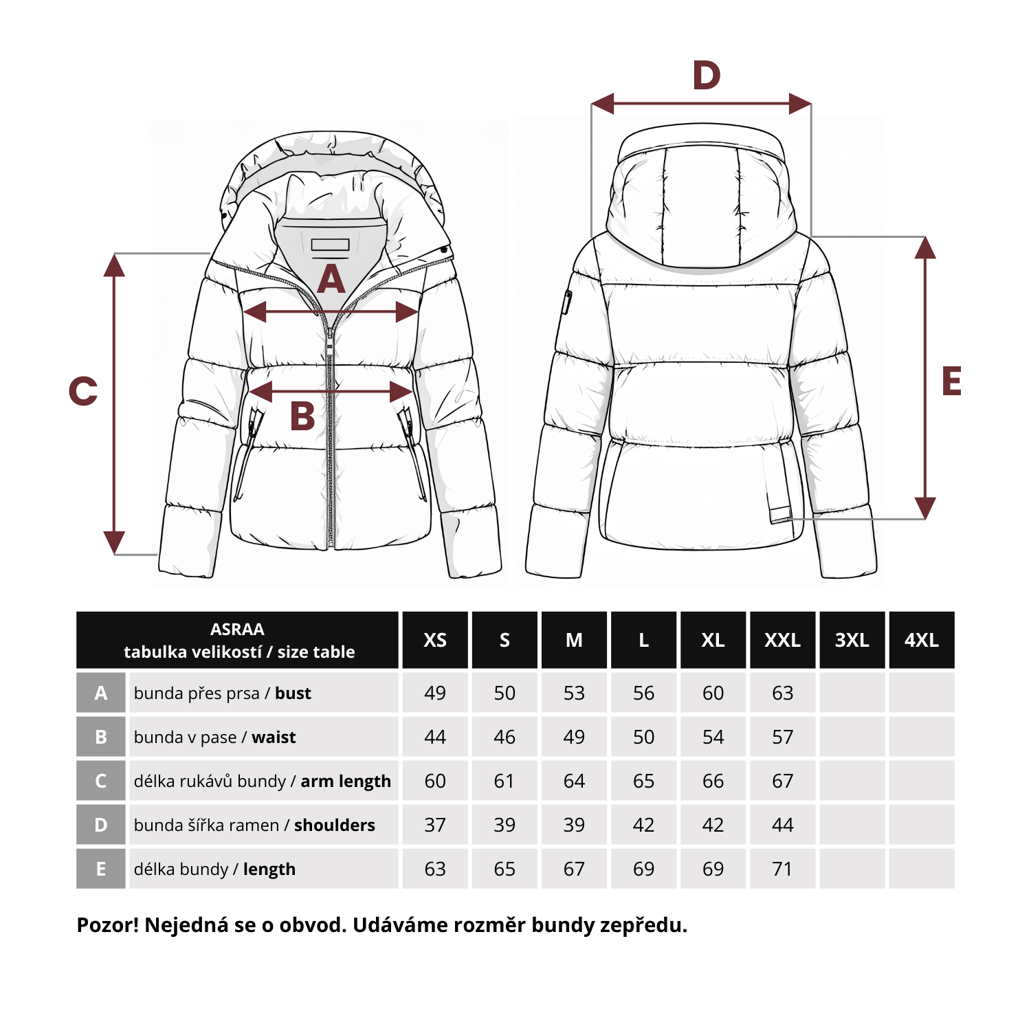 Přeměřte si doma bundu, která Vám sedí. Dejte si ji na zem - změřte zepředu rozměr přes prsa, rozměr v pase a další