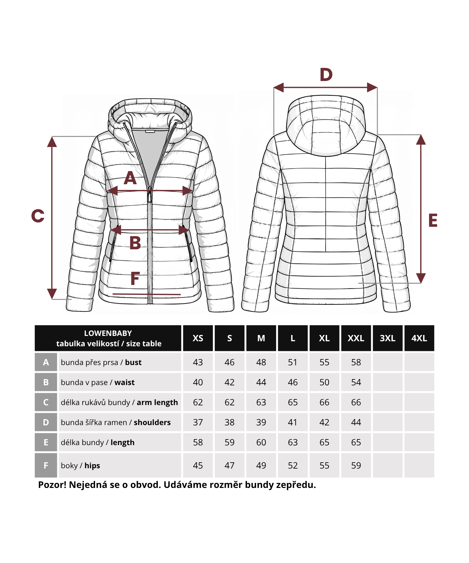 Přeměřte si doma bundu, která Vám sedí. Dejte si ji na zem - změřte zepředu rozměr přes prsa, rozměr v pase a další