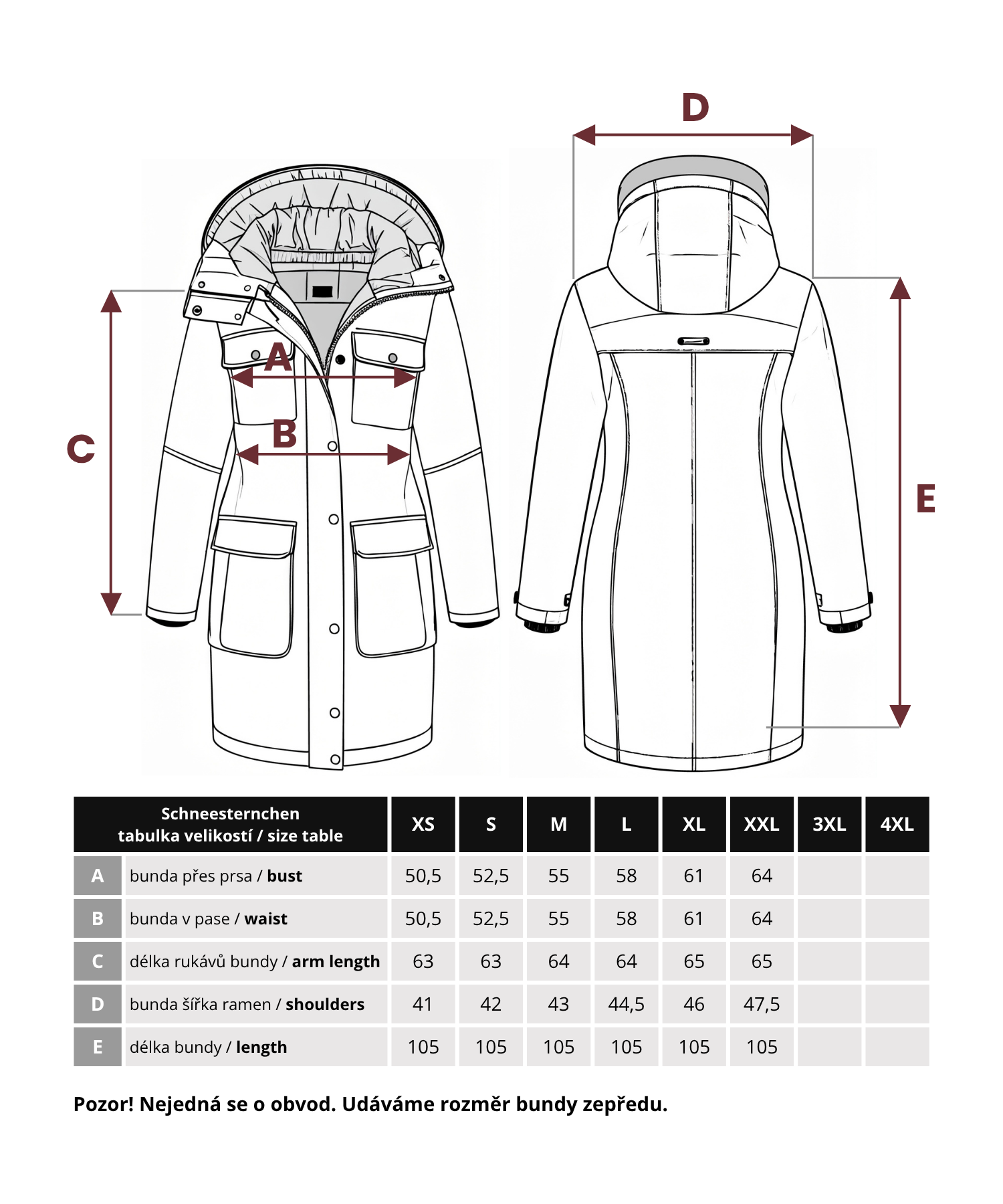 Přeměřte si doma bundu, která Vám sedí. Dejte si ji na zem - změřte zepředu rozměr přes prsa, rozměr v pase a další rozměry a porovnejte s touto tabulkou. Obvod je přibližně 2x tolik, co se uvádí v tabulce. Rozměry odpovídají klasickým evropským velikostem.