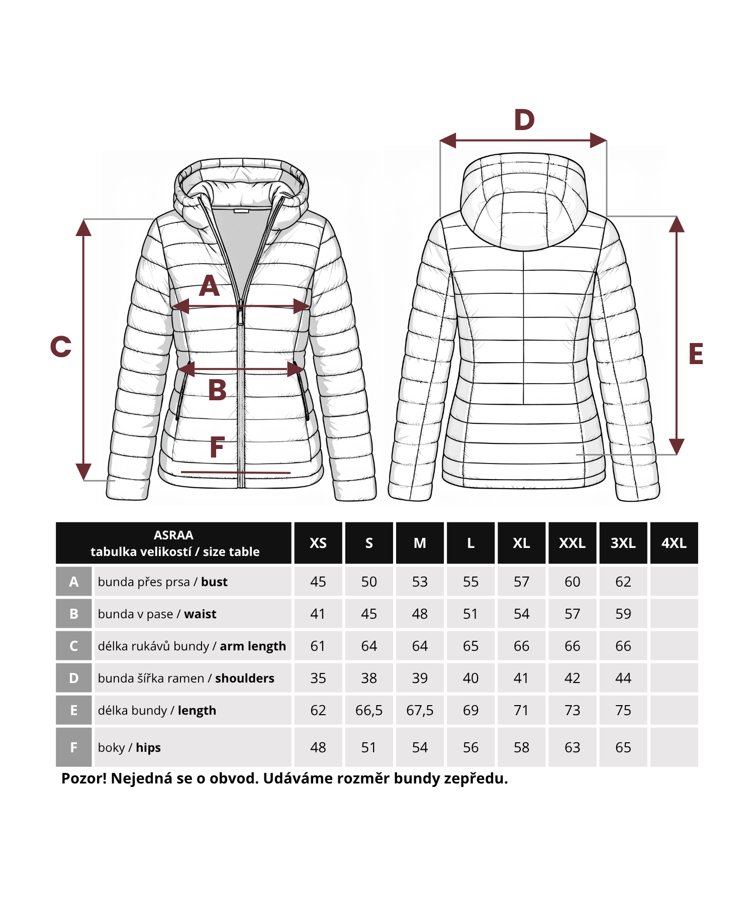 Přeměřte si doma bundu, která Vám sedí. Dejte si ji na zem - změřte zepředu rozměr přes prsa, rozměr v pase a další