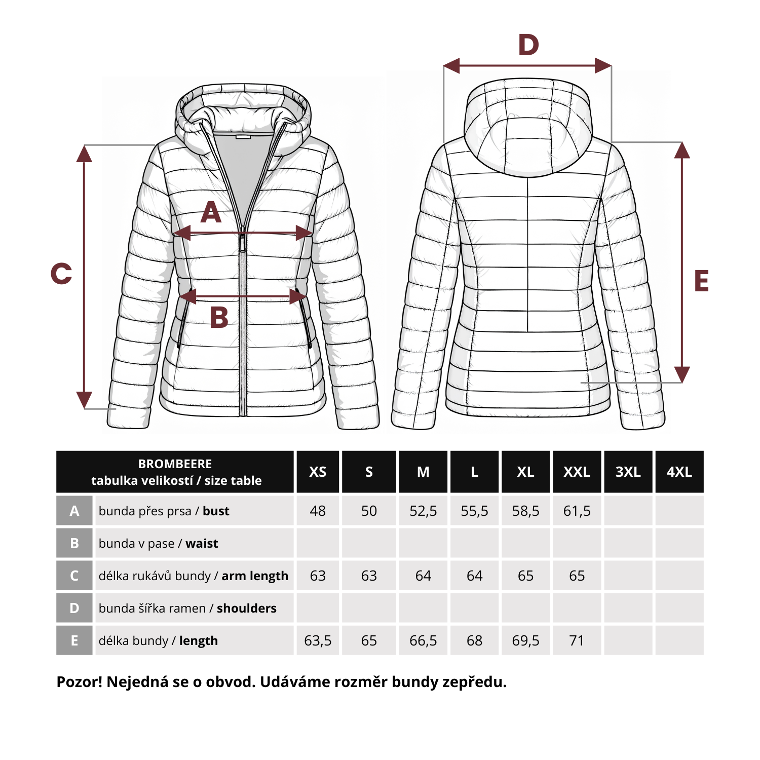 Přeměřte si doma bundu, která Vám sedí. Dejte si ji na zem - změřte zepředu rozměr přes prsa, rozměr v pase a další